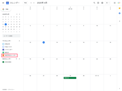 新規作成したカレンダーが表示されますので、カレンダーにスケジュールを記入していきましょう。(Googleカレンダーへの記入方法は省略させていただきます)